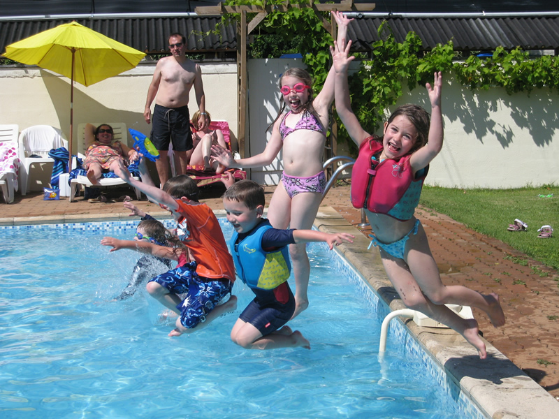 The main lawn/playground and all the cottages are separated from the pool area by two gates, a 1.8m high wall, and the car park. See the complex layout (link from homepage) for full details of where everything is relative to everything else.